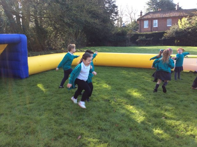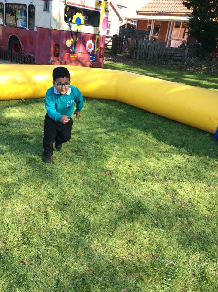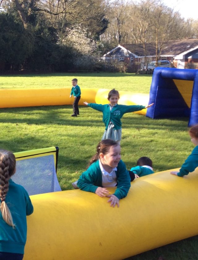 In Spring 2 we invited Trevor from Football Fun into school. He brought the inflatable football pitch in and all children from Nursery – Year 2 got the opportunity to enjoy lots of team games and fun!