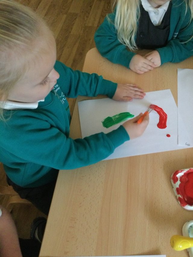 We found out how we can make different colours by mixing some colours together. We experimented with paint like artists and with pipettes and water like scientists.
