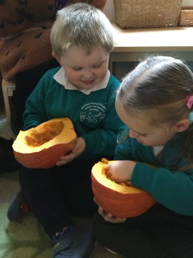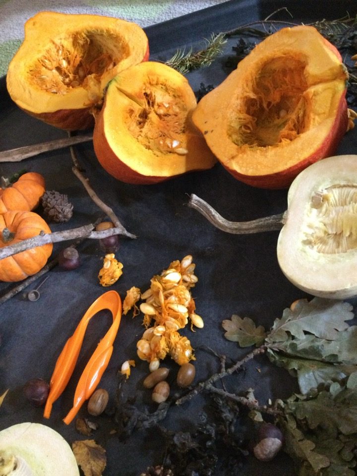 We explored the Autumn items that we collected in our Autumn treasure bags. We found conkers, pumpkins, leaves, acorns and even seaweed!