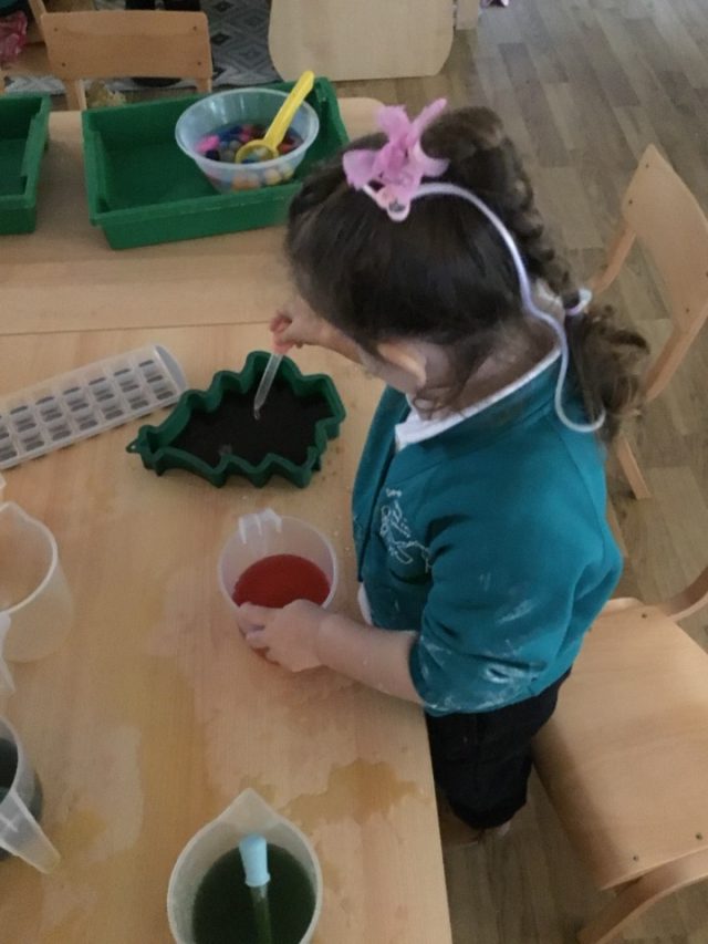 In Autumn 2 we continued learning about ourselves and our bodies. We had a fun afternoon learning about our senses. We used our sense to taste, smell, hear, feel and see different Christmas themed items…chocolate, tinsel, lights, bells and some other items like slime, basil and marshmallows.